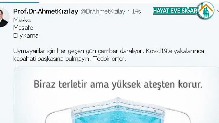 Kızılay, “Maske, mesafe ve el yıkama önemlidir. Uymayanlar için her geçen gün çember daralıyor. Covid 19’a yakalanınca kabahati başkasına bulmayın. Tedbir önler. Maske biraz terletir ama yüksek ateşten korur" ifadelerine yer verdi.