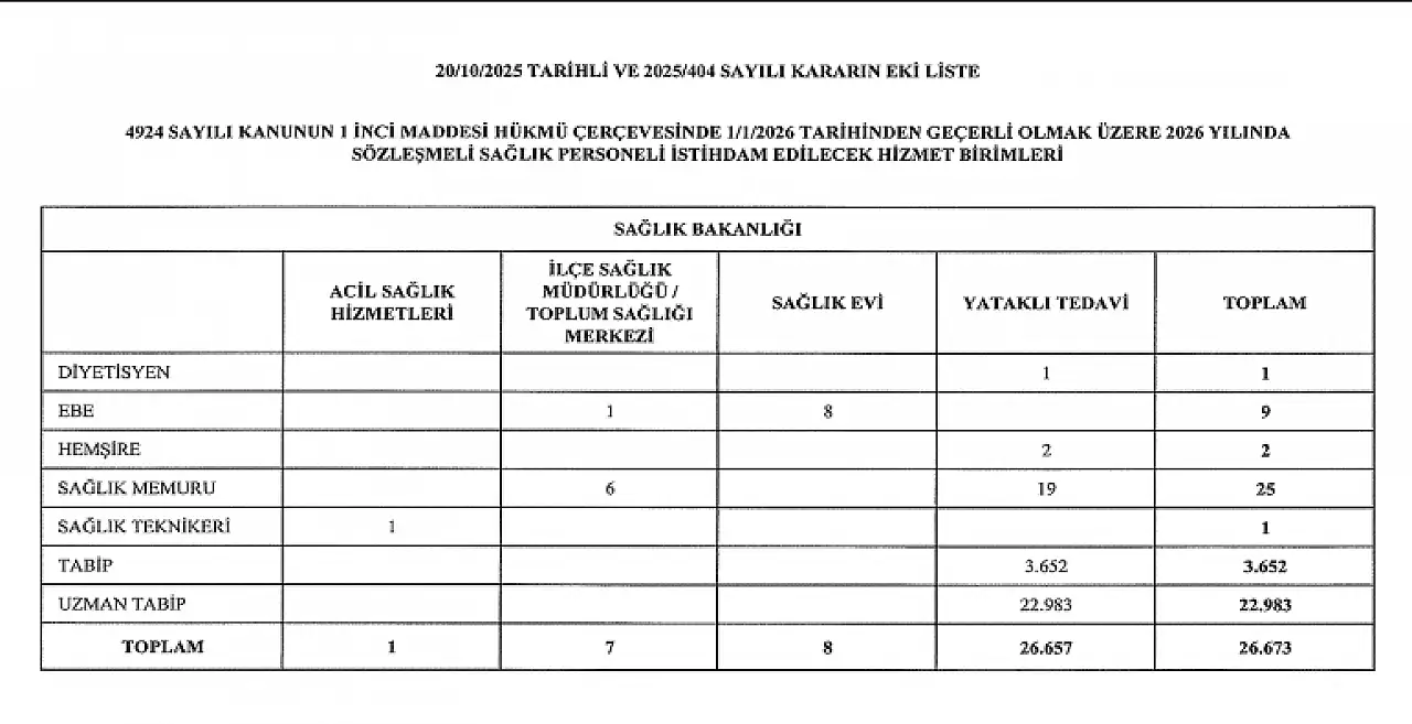 Resmî Gazete'de yayımlanan karara göre, Sağlık Bakanlığı önümüzdeki yıl 26 bin 673 sözleşmeli sağlık personeli istihdam edecek. Alımlar, eleman temininde güçlük yaşanan bölgelerde ve kritik hizmet alanlarında yapılacak.