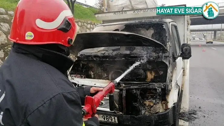 Kocaeli'nin Körfez ilçesi D100 Karayolu'nda seyir halindeyken motor kısmı alevlere teslim olan kamyonette çıkan yangın itfaiye ekipleri tarafından söndürüldü.