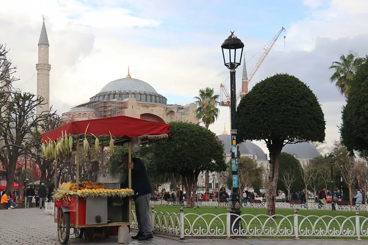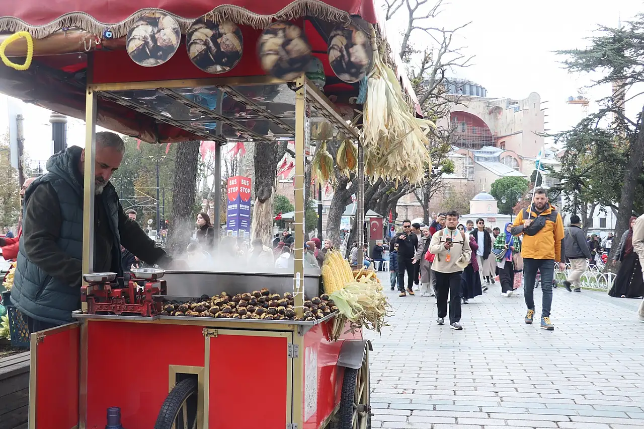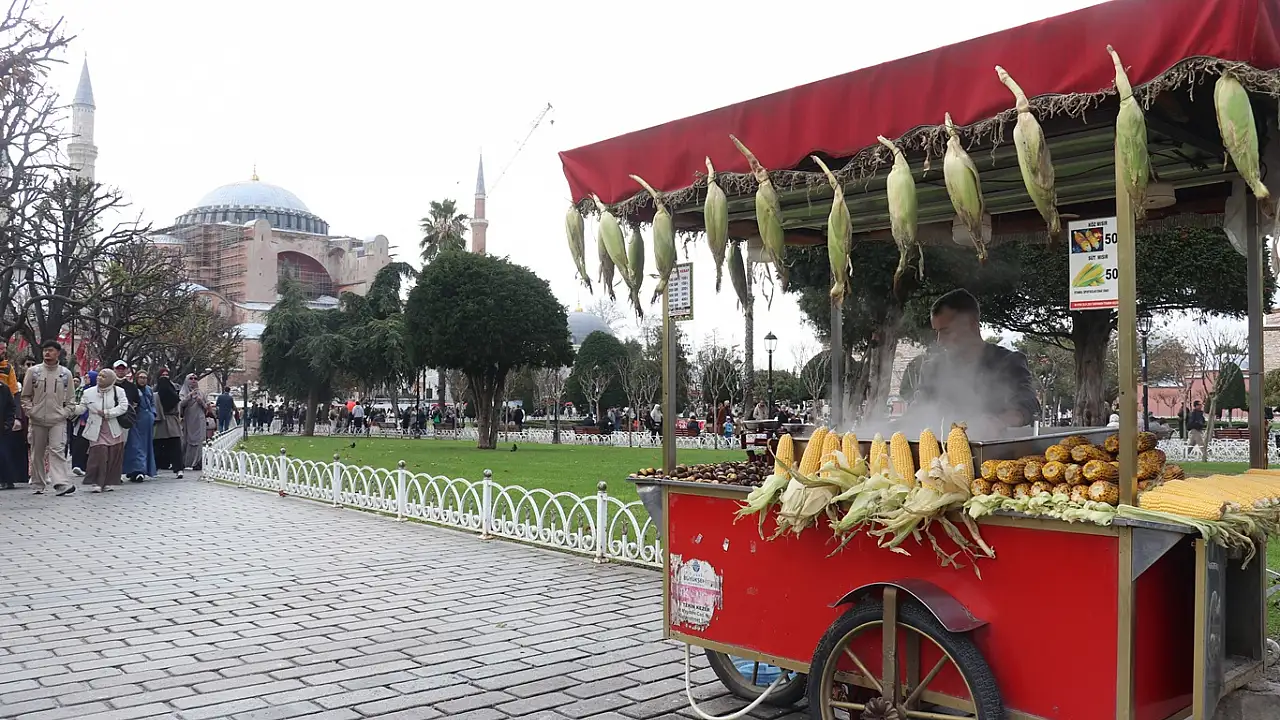 Ayasofya'nın ihtişamının altında sıralanan seyyar arabalarda közde pişen sıcak kestaneler, serin rüzgârın estiği sonbahar günlerinde kokusuyla insanları cezbederken mısırın tüten sıcak buharı ve tatlı kokusu ise adımların tezgâhlara doğru ilerlemesini sağlıyor.