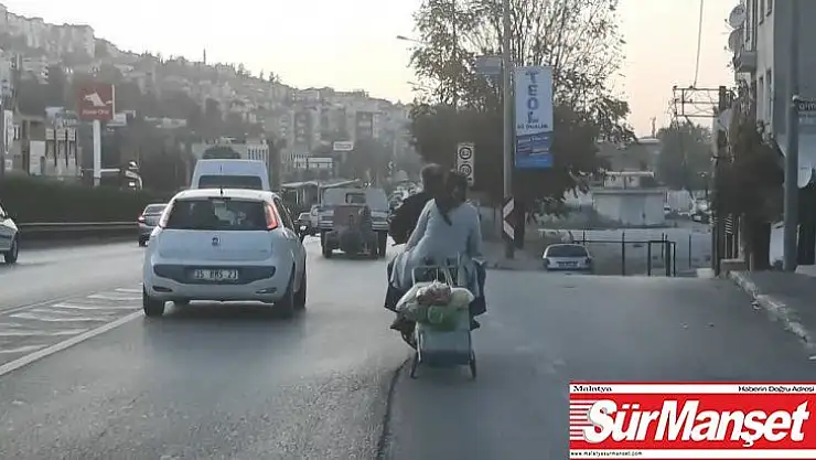 Bursa’da cep telefonuyla kaydedilen görüntüler yürekleri ağza getirdi. Bursa - İzmir yolu üzerinde bir erkek ve bir kadın, motosikletin arkasına bağladıkları pazar arabasıyla araçlara aldırmadan bir süre ilerledi. Motosiklet sürücüsü ve arkasındaki kadının kask takmadığı görüntülere yansırken, sebze, meyve dolu pazar arabasının tekerleklerinin de çıkmak üzere olduğu görüldü. Bir süre ana yol üzerinde ilerleyen çift, ardından bir yola saparak evlerinin yolunu tuttu.