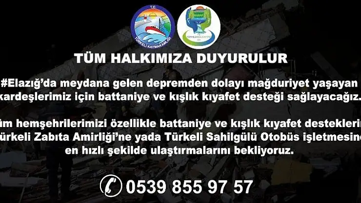 "Elazığ’da meydana gelen depremden dolayı mağduriyet yaşayan kardeşlerimiz için battaniye ve kışlık kıyafet desteği sağlayacağız. Tüm hemşehrilerimizi özellikle battaniye ve kışlık kıyafet desteklerini Türkeli Zabıta Amirliğine en hızlı şekilde ulaştırmalarını bekliyoruz" denildi.