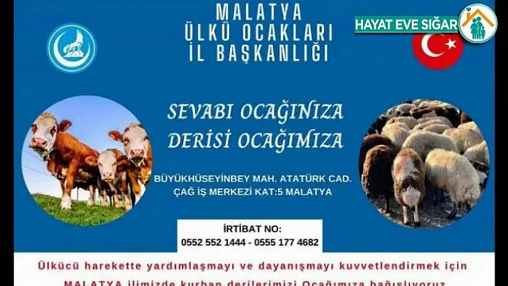 Ülkü Ocakları Malatya İl Başkanı Turgay Şengönül, 'Sevabı Ocağınıza, Derisi Ocağımıza' sloganıyla Kurban Bayramı'nda kesilecek kurban derilerinin Ülkü Ocaklarına bağışlanması yönünde çağrı yaptı.