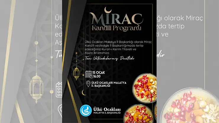 Ülkü Ocakları Malatya İl Başkanlığı, Miraç Kandili dolayısıyla İl Başkanlığı binasında Kur'an-ı Kerim tilaveti ve aşure ikramı düzenleyecek. Program, tüm vatandaşların katılımına açık olacak.