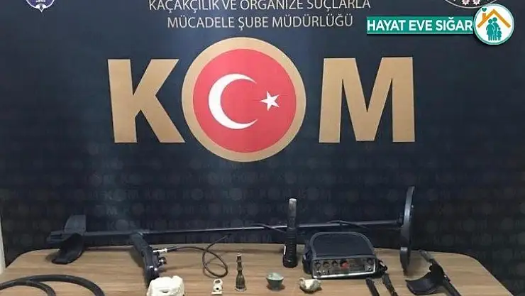 Malatya Emniyet Müdürlüğü Narkotik Suçlarla Mücadele Şube Müdürlüğü görevlileri tarafından “Uyuşturucu Madde İmal ve Ticareti” soruşturması kapsamında M. E. İsimli şüphelinin ikametinde arama yapıldı. Aramada tarihi eser olduğu değerlendirilen, topraktan yapılmış, biri kırık olmak üzere 3 adet kase, 1 adet üzerinde hayvan figürü bulunan taş parçası,1 adet bakır mumluk,1 adet topraktan yapılmış kırık pipo,1 adet bakır fincan,14 adet sikke,1 adet yüzük,2 adet kemer tokasına benzeyen demir parçası,1 adet çekiç görünümlü demir parçası, 2 adet el dedektörü ele geçirilerek söz konusu malzemelere el konuldu.