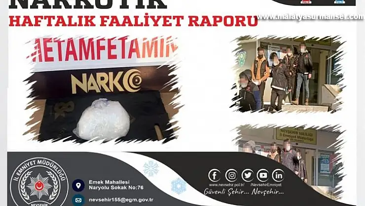 Nevşehir Emniyet Müdürlüğünden yapılan yazılı açıklamaya göre il genelinde uyuşturucu madde kullanımına yönelik olarak yapılan çalışmalarda toplam; 11,30 gram toz esrar, 2,08 gram plaka esrar, 4,20 gram eroin, 10,92 gram metamfetamin, 1,36 gram sentetik kannobinoid (Bonzai) ve 6 adet ecstasy hap ele geçirildi. Yapılan çalışmalarda ayrıca ’Uyuşturucu veya Uyarıcı Madde İmal ve Ticareti’ suçlarından, 4 şahıs hakkında şüpheli olarak işlem yapıldı. Haklarında ’Uyuşturucu Madde Ticareti Yapmak veya Sağlamak’ suçundan emniyetteki işlemleri sonrası adli makamlara sevk edilen İ.Y. ve yabancı uyruklu D.R. ve H.E. tutuklandı.