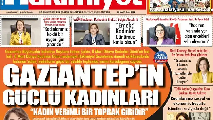 Gaziantep’te yerel Hakimiyet Gazetesi 8 Mart Dünya Kadınlar Günü dolayısıyla özel sayfa tasarımı yaptı. Gazete kadınlara özel baskı ile okuyucuların karşısına çıktı. Gazetede şehirde kadın belediye başkanı, milletvekili, siyasi parti temsilcileri, sivil toplum kuruluşu temsilcisi ile emek noktasında faaliyet gösteren kadınları haberleştirildi.