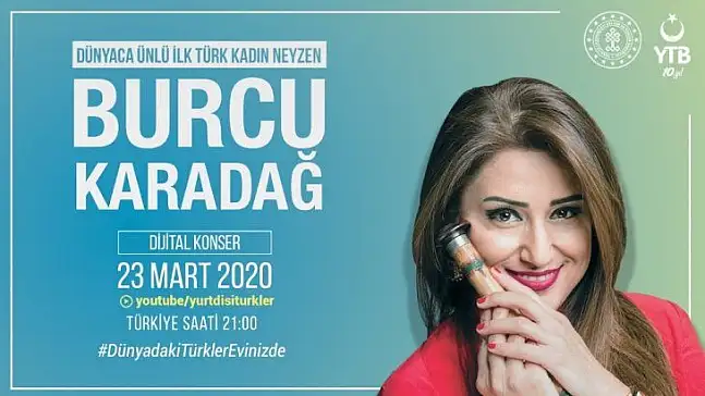 Yeni tip Korona virüs (Covid-19) tedbirleri kapsamında sokağa çıkma yasağı ve karantina uygulanan ülkelerde bulunan Türk vatandaşları için moral niteliğinde olacak bir diğer konser dünyaca ünlü ilk Türk kadın neyzen Burcu Karadağ tarafından icra edilecek. Burcu Karadağ 23 Mart 2020 Pazartesi günü, Türkiye saati ile 21.00’de “online” ney üfleyerek evde kalan vatandaşları müzikle farklı bir yolculuğa çıkaracak.